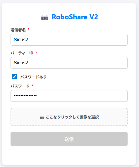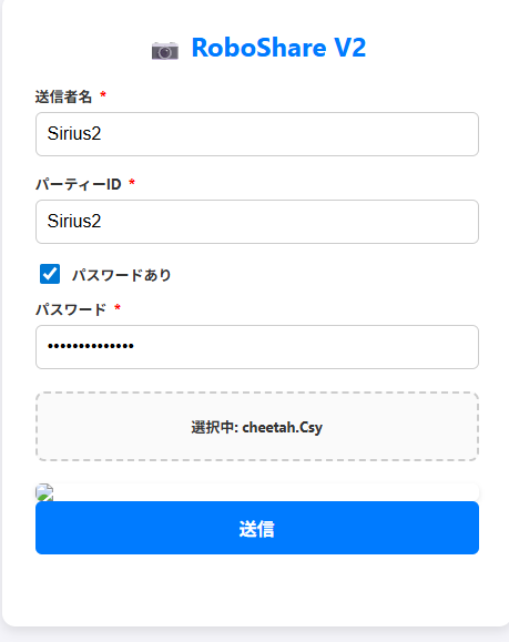 RoboShereはファイル,ユーザーネーム,パーティーID,パスワードを入力すると、ファイルを送信できるツールです。